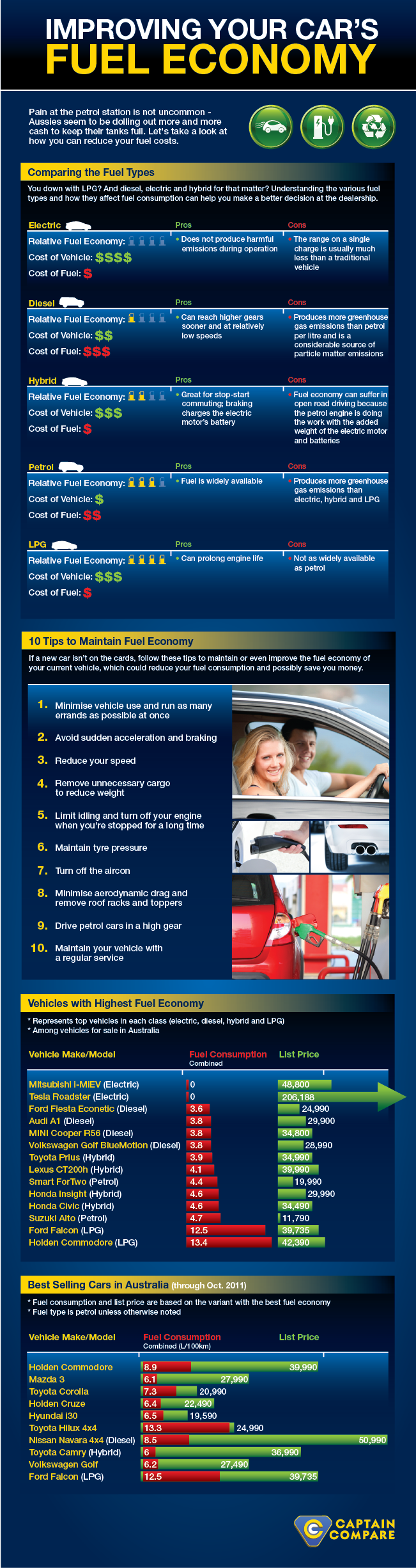 Petrol prices burning a hole in your pocket? You’re not alone. Fuel costs will continue to rise due to the basic economics of supply and demand. So unless you plan on getting rid of your trusty vehicle and turning to alternative transportation, reducing fuel consumption is one of the best things you can do to lessen the pain at the pump. Fortunately, there are a number of incredibly efficient cars on the market today, as well as several techniques to maintain and, in some cases, improve your current vehicle’s fuel economy, as depicted in the infographic below.